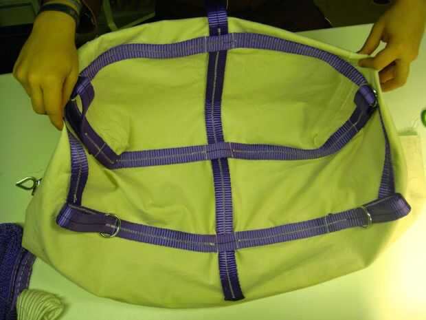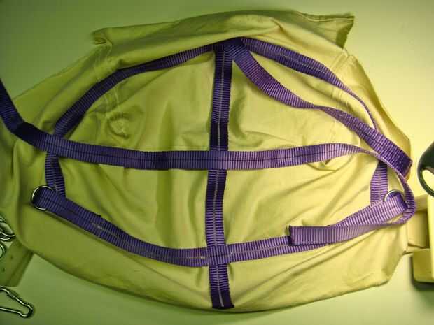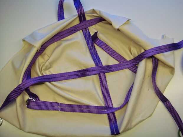 cuando tengas la forma de tazón de fuente, puede coser la segunda correa horizontal, que es 15 cm por encima de la primera correa horizontal. Asegúrese de que los extremos (+ - los últimos 20cm) sin embargo no se cosen en. Esto que se necesita para hacer lazos para los anillos de metal