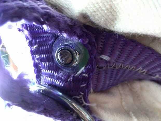 Cuando la correa de la esquematización es cosida en, puede coser extremos en todo el extremo horizontal, hacer un lazo con un aro metálico dentro del bucle, luego coser el lazo, para que el anillo no puede caer hacia fuera. (cuadro 3, la primera correa lo ha hecho así)