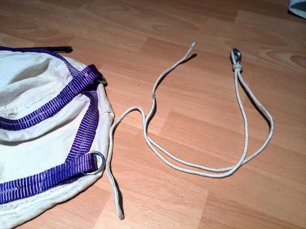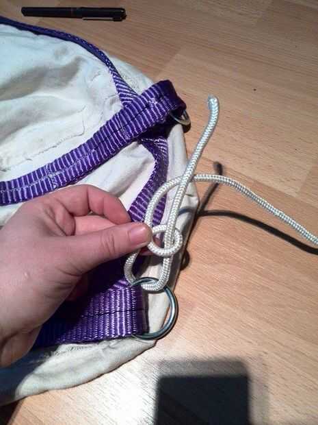 luego utilizará un nudo as de guía para hacer un lazo alrededor de los anillos del asiento. Asegúrese que el anillo más alto va a necesitar una pieza más corta de la cuerda, (cuadro 5-8) que hice para que entre el nudo de as de guía y la figura 8 fue allí donde se puede econtrar 45 cm de cuerda, en el anillo situado más bajo, y 40 cm, en el más alto localizado el anillo. hacerlo en ambos lados.
