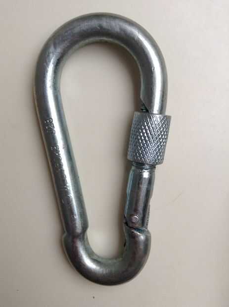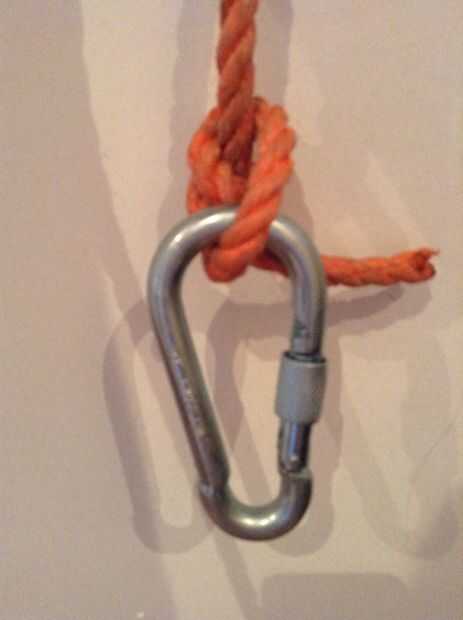Yo no uso mosquetón en mi swing pero lo uso como un peso para lanzar mi cuerda sobre la rama. Hacer un nudo doble como se muestra antes pero ahora hago esto para sujetar mi mosquetón a la cuerda.