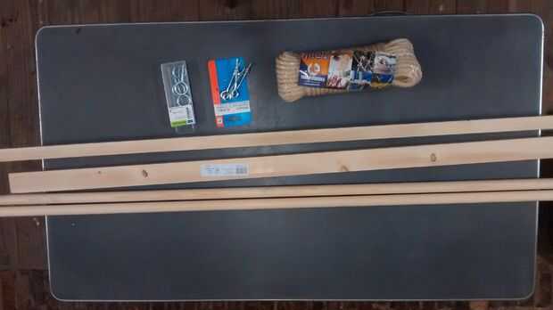 También usé alguna cuerda y dos juegos de pernos de argolla, un sistema de cáncamos y un sistema de tornillo de ojos.