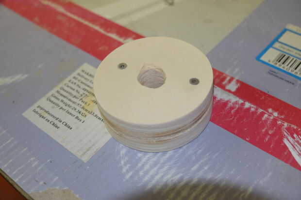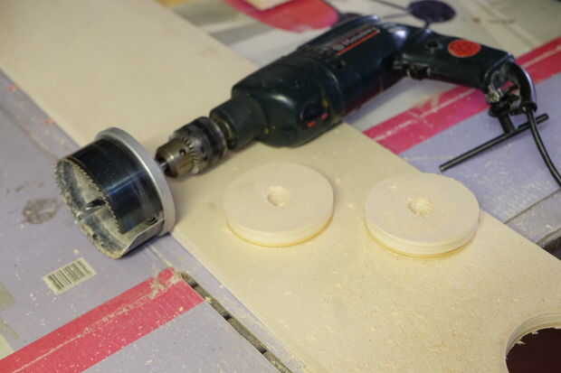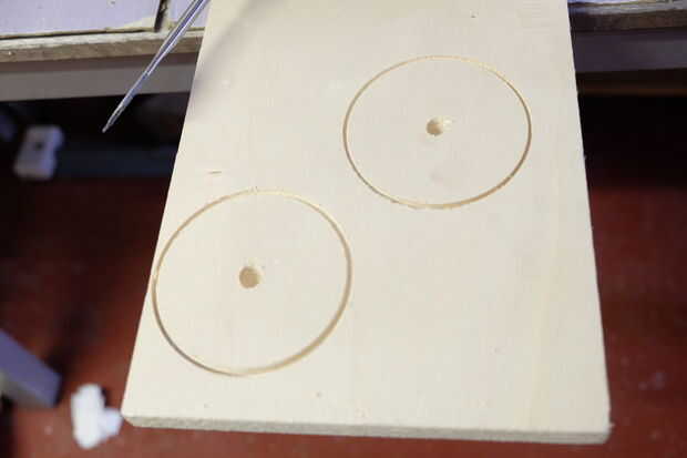 • Vio dos rondas pequeñas hacia fuera con la Sierra de agujero de Ø 95 mm. En el centro de estas rondas se perfore un agujero con la broca de pala de 20 mm Ø.