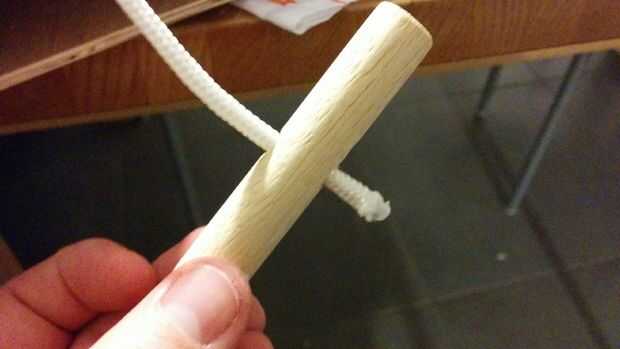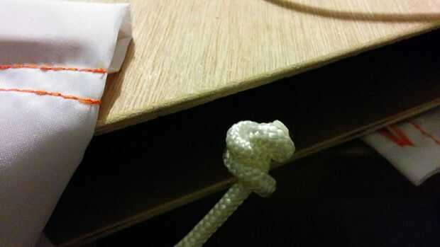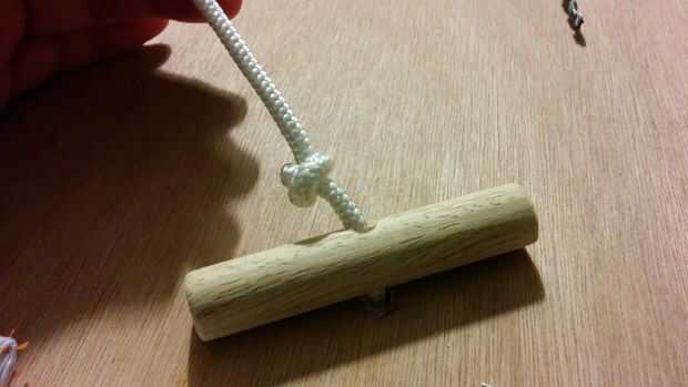 Taladro 2 agujeros 50 mm desde el borde y en el centro. A través de la cuerda fina del hilo de rosca y hacer un pequeño nudo doble. Después de Repita el a través de proceso los tacos.