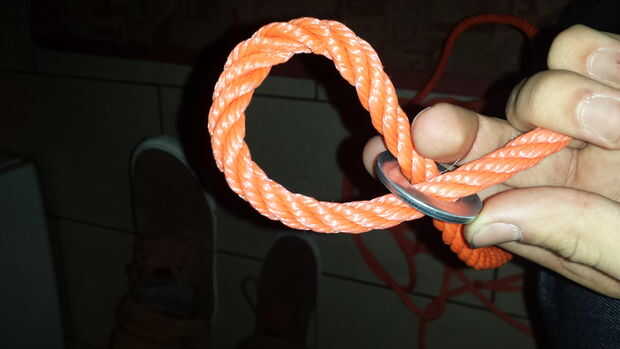 pones la cuerda a través de la arandela de empuje y luego haces un lazo y pones la cuerda otra vez a través de la arandela de empuje, si tira de la cuerda de la arandela de empuje se fije y permanecer en el lugar, la arandela de empuje finalmente se colocará en la ranura una vez que cuelga el columpio en la rama. debido a la arandela de empuje puede establecer alturas fácilmente, y será lo suficientemente fuerte para transportarle.