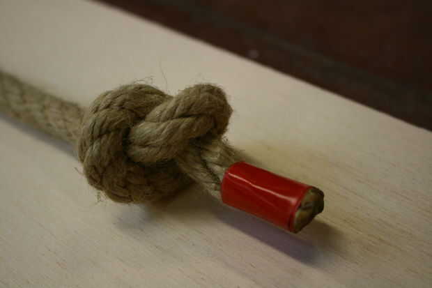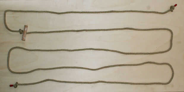 -Tomar la cuerda y sting el palo que acaba de hacer en él. Moverlo a +/-2m desde el principio y hacer un nudo justo después del palo de madera. Entonces hacemos dos nudos, uno al principio y otro al final de la cuerda. (Foto 4)