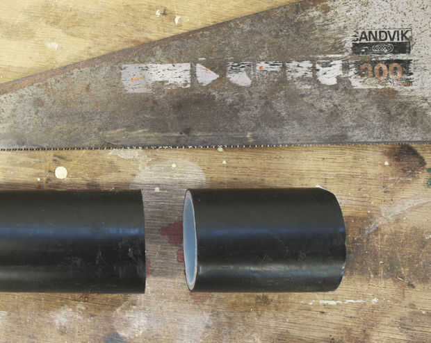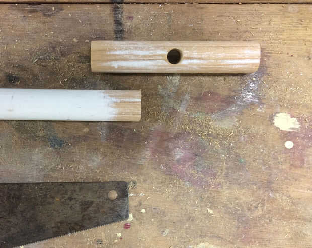 -Tomar el palo de madera y vio a una longitud de + /-120 mm. taladro un agujero con diámetro de 11mm en el centro del palo. (Foto 1)