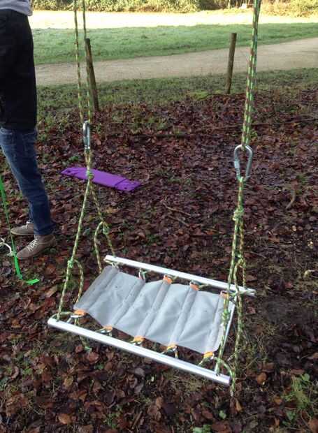 Si lo has hecho, tomar los extremos de las cuerdas y puso sobre la barra de madera y entre las cuerdas atadas a la barra. entonces baje los, hasta el punto donde la barra golpea la rama. Se puede ver en la primera foto, si usted mira de cerca. Luego tomar la oscilación real (donde se sentar en) y colgar los mosquetones en los bucles de cuerdas colgando del árbol. Se cuelga el columpio. Basta con poner las barras de aluminio pequeño entre los grandes. Ajustar su altura y disfrutarte nociones!