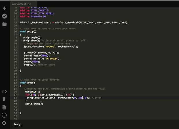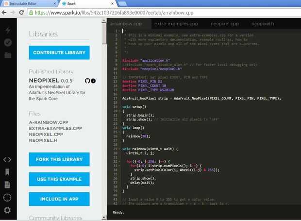 Una vez que exitosamente han afirmado base, usar Web IDE https://www.spark.io/build