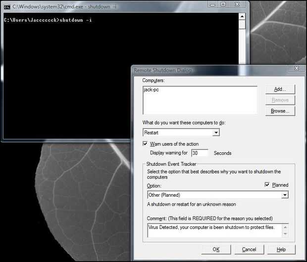 Entonces usted puede ir y poner en lo que quieras, lo que quieres estos equipos, por ejemplo apagar o reiniciar. Puede Agregar cuanto tiempo puede dar el usuario para guardar allí trabajar, poner en "0" para no hay tiempo. Luego ir y rellenar las otras opciones. La sección de comentarios es lo que mensaje sale en pantalla cuando indica el apagado, reinicio y apagado, el comentario tiene que ser rellenado, pero con el cierre inesperado, usted puede dejarla en blanco. Así en la sección de comentarios que puse algo muy "miedo" "Virus detectado, el equipo se ha apagado para proteger los archivos"