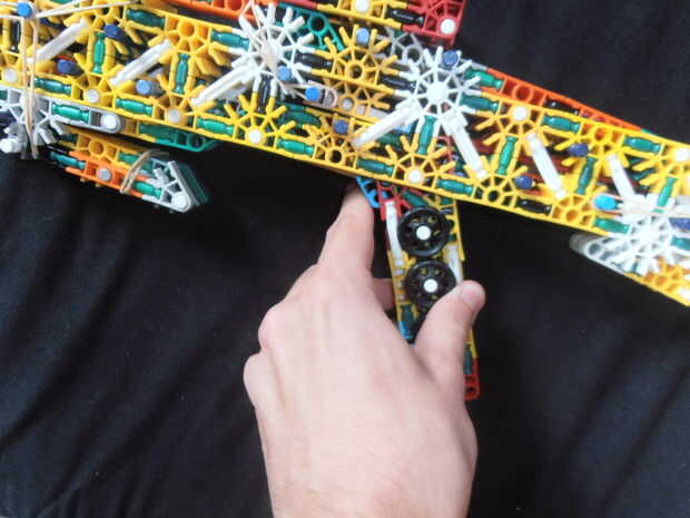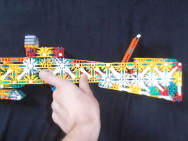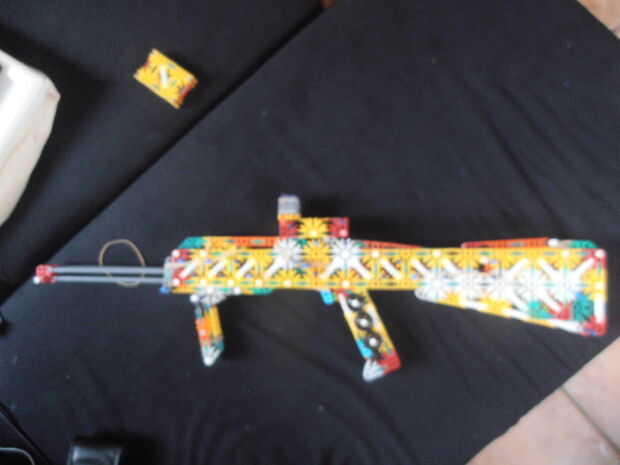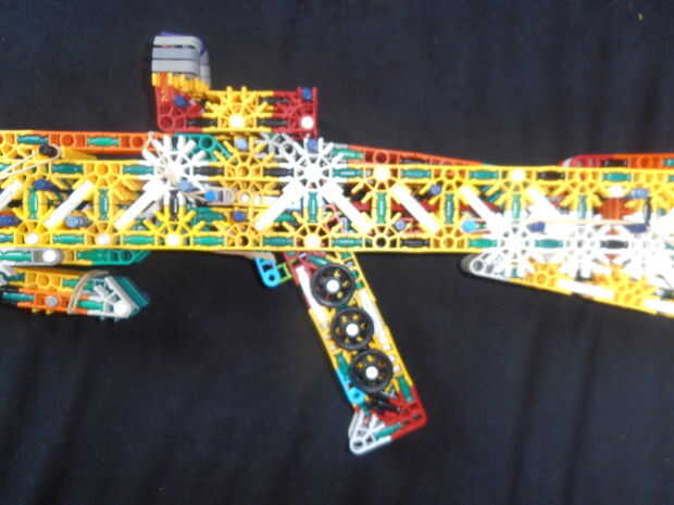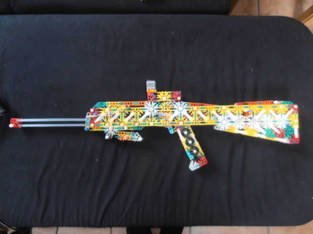 El pestillo en la parte posterior se abre tirando de una barra azul, que está situada arriba del gatillo hacia atrás.