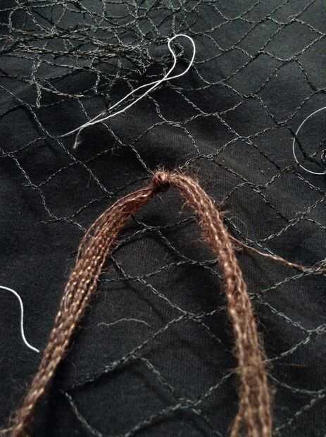 Un pequeño hilo de arpillera pasar a través de una sola hebra en la red sobre el bucle de la cadena de entrada y pasar por el bucle. Una explicación indescriptiblemente horrible pero creo que puede hacer un nudo simple. empiece en la parte inferior y forma para arriba sistemáticamente. Resistir la tentación de saltar hacia arriba como haciendo él fila por fila los hilos colgando y cubren los nudos anteriores.