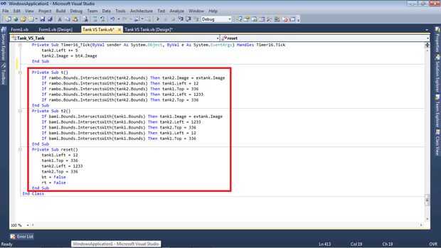 en mi código he tenido cosas como: t(), t2() y reset() son mis subs t() detecta si la munición roja choca con las fronteras de la forma o el tanque azul; T2() detecta si la munición azul golpea el tanque rojo o la forma; y reset() devuelve el campo de juego