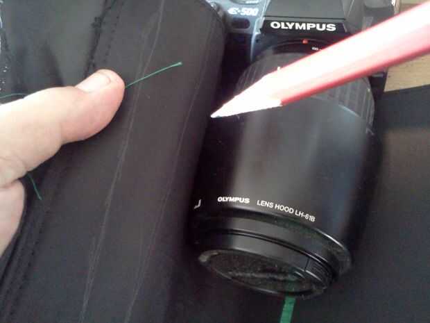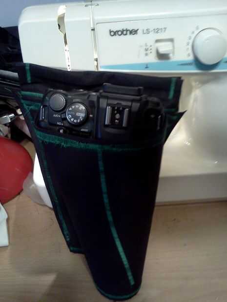 Usando su cuerpo de la cámara y la lente más larga imitan para arriba los bordes para cortar la forma exterior de la funda y luego hacer los cortes