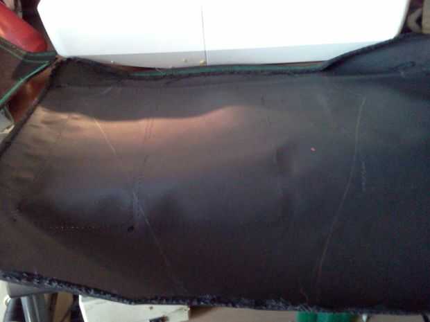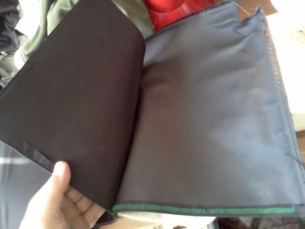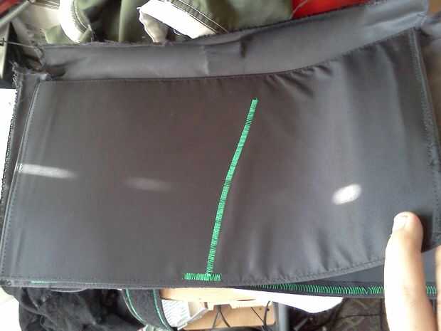 En primer lugar el material externo y el respaldo rígido (éste era el material que se utilizó para separar las carpetas de archivos y papel en el caso de la laptop) y ejecutar una puntada de estabilización por el centro para unir las dos piezas juntas