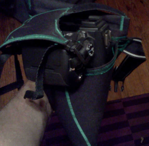 Para terminar la funda agregar las correas de la correa y una correa para la pierna con el fleje de web y las hebillas de las correas de caso y la cámara vieja. Punta las correas del cinturón era una obvia una vez que tengas la correa para la pierna atada, coser en una longitud de fleje que va hacia arriba a su cintura, la hebilla de la funda alrededor de la pierna y alimentar la banda superior sobre su medida de correa su longitud loo, y luego coserlo. Lo mismo para agregar un cinturón de lazo trasero y todo hecho.