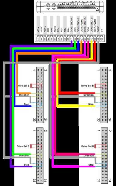 Los requisitos de cableado de myFloppyDriveOrchestra son sorprendentemente simiple, porque cada unidad tiene sólo dos líneas digitales - uno para paso y otro para la dirección. Usted también necesita cortocircuito los pins select drive y conectado a los pines de tierra a tierra DIO de la myRIO. La siguiente imagen illastrates cómo cablear un "Cuarteto" de floppydrives a la myRIOs integrado conector del MSP. Para controlar una orquesta completa 16 piezas, necesita replicar este cableado en dos conectores MXP en el reverso del lado fo el myRIO.