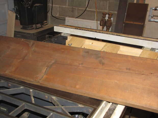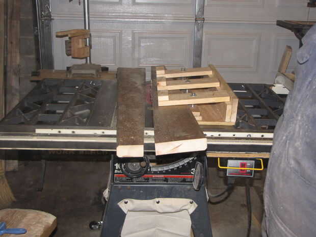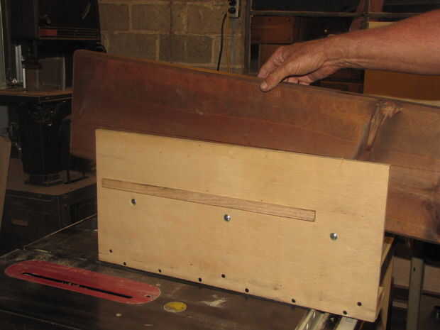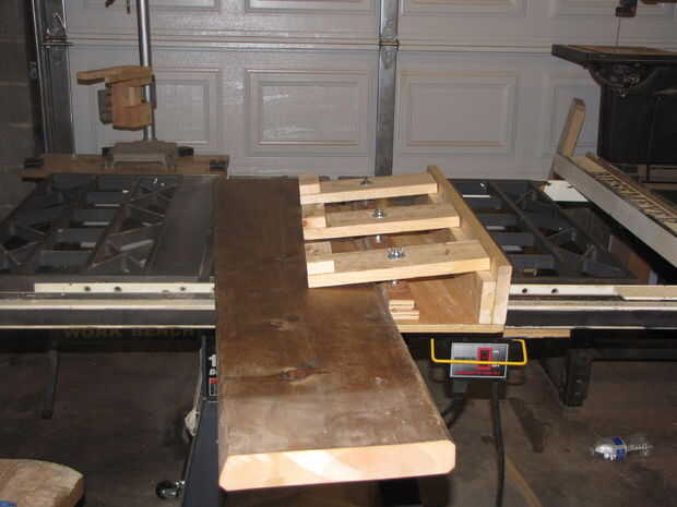 Gire el trineo en el borde para que pueda ver el fondo del trineo y la parte inferior del tablero. Alinee esta marca con el borde cortado del trineo. ¿Recuerdas cuando nos recortan el borde del trineo en el paso 5? Tenemos un borde conocido para trabajar con y donde colocamos la pieza de trabajo es lo que se cortará. Apriete las tuercas de mariposa para sujetar la pieza en su lugar. Coloque el trineo en la ranura de la barra de guía y hacer su corte.