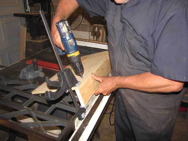 Fije una pieza de 1 x 4 en el borde derecho de la madera contrachapada. Perfore orificios piloto de les avellane y fije el 1 x 4 con tornillos.