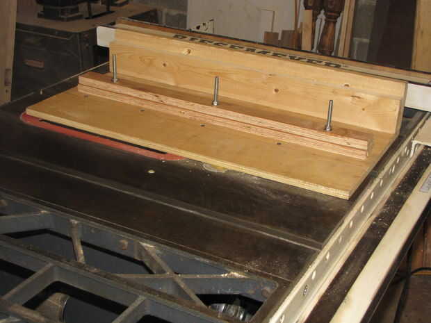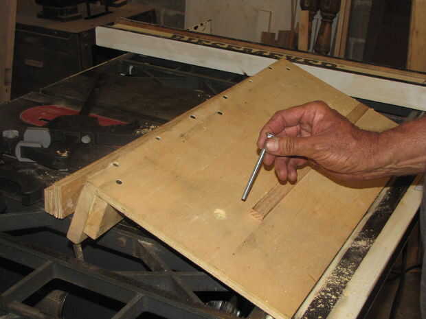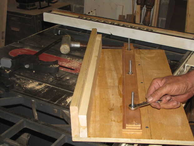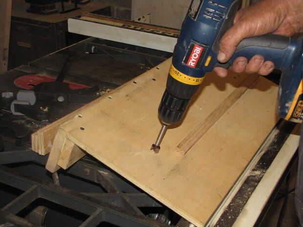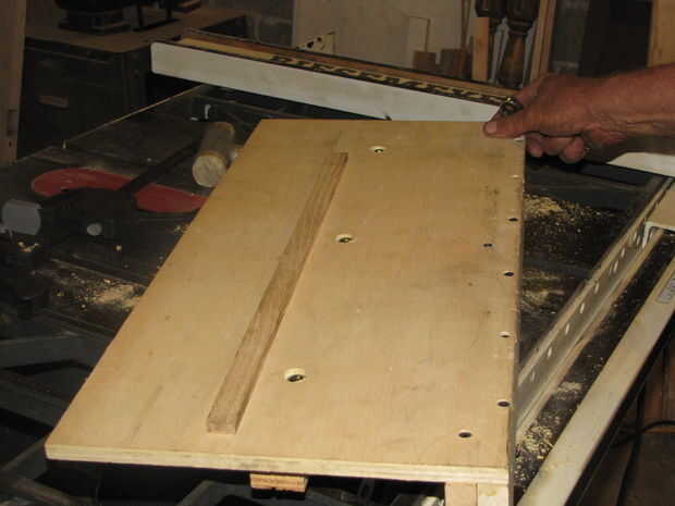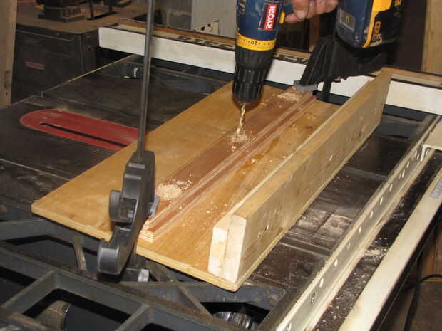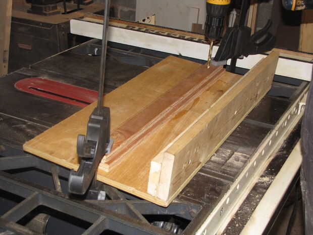 Perfore tres agujeros equidistantes de ¼" las dos tiras y el trineo. No taladrar la mesa. Usando una broca Forstner o broca paleta, ensanchar relieves en la parte inferior del trineo para hacer espacio para las cabezas de perno de carro que se insertará en la parte inferior. Taladro solamente tan profunda como necesaria. Aproximadamente 1/8" debería ser suficiente.