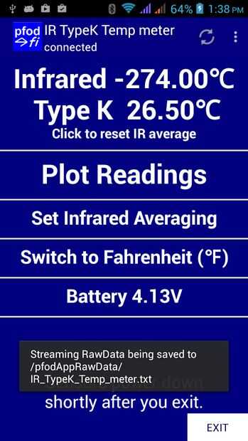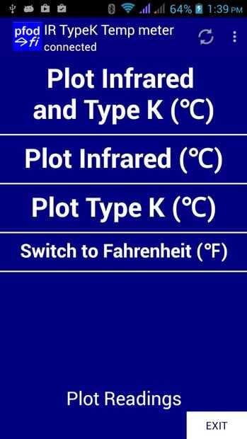 Una Junta de FioV3 se utiliza como el arduino y puede ser equipada con ya sea un módulo de bluetooth o Wi-Fi para conectarse a la pfodApp Android que muestra las lecturas, controla el promedio y la parcelas y registros de los resultados. El FioV3 incorpora una batería de ión litio y cargador. La unidad se enciende pulsando el botón de encendido después de que es siendo alimentado por mucho que haya una conexión de la pfodApp. 60 segundos tras la desconexión de la pfodApp, el módulo de temperatura IR y tipo K los poderes abajo completamente (< 1uA). El proyecto hace algunas modificaciones en el tablero estándar de FioV3 para corregir algunos problemas de diseño.