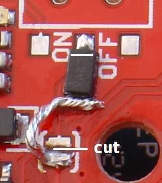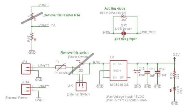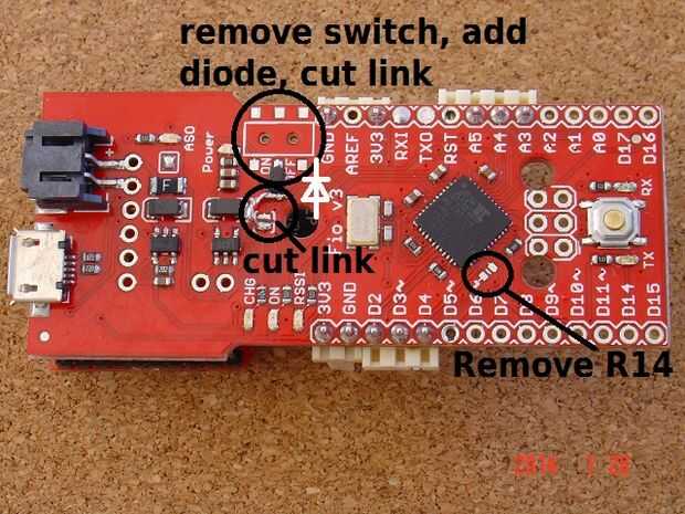 El circuito de arriba muestra la resistencia a ser eliminado, el interruptor a quitarse, el puente a cortar y el diodo, MBR129VSOD123, que se agregará. El diodo permite la Junta ser alimentado por el USB mientras que evita que la batería la alimentación hacia el circuito USB cuando con pilas.
