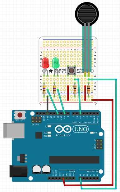 Utilicé un resistor sensible de la fuerza para el sensor resistivo, pero una célula fotoeléctrica o un sensor de curva funcionará igual de bien. También se puede utilizar un potenciómetro. Para un potenciómetro de alambre el resistor de 10K se olvide, conecte el conductor medio al perno, plomo de un extremo al carril positivo y el otro a tierra.