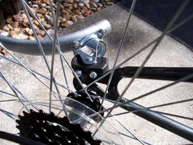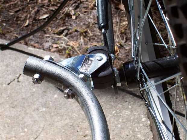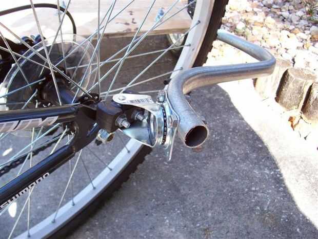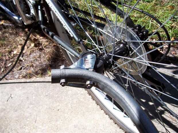 Este diseño inicial dio lugar a un diseño de enganche que trabajó sólo si yo no alejarse del nivel del suelo, apoyar la bicicleta en el stand de tiro o dejarla caer. Pronto amaneció en mí que un diseño de enganche de remolque buen requiere provisión para todos los tres ejes de yaw, pitch y roll. Desde que vivo en una zona montañosa con muchos baches, barrancos y pendientes esta configuración, que carece del rodillo, no era lo suficientemente buena como para hacerme más allá de la entrada así que comencé a pensar en una manera de agregar rollo en muy bajo costo...
