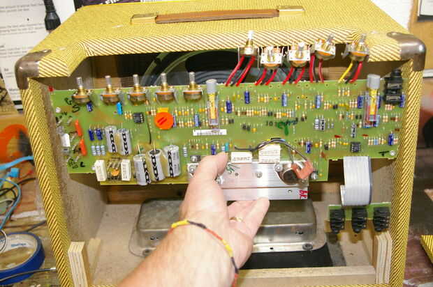 Altavoz Peavey era un reemplazo directo (tuvo un leve desgarro en la envolvente que debían fijarse en primer lugar, hay un montón de sitios que describen ese arreglo fácil, así que no entraré en eso aquí). El tanque de reverb sólo va en la parte inferior.
