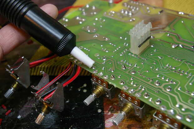 Now the tedious part. Había soldado de cada maceta. Cada maceta tenía cuatro puntos de anclaje y tres conexiones eléctricas. El primer pote era un oso, pero después me di cuenta de los ángulos y cuánto presión, etc., tiene bastante fácil. El punto principal aquí es tomar tu tiempo y averiguar cómo ellos originalmente unen cosas por lo que puede revertir el proceso... más o menos. El producto final fue sueltas macetas con 2-3" lleva a la placa de circuito.