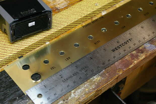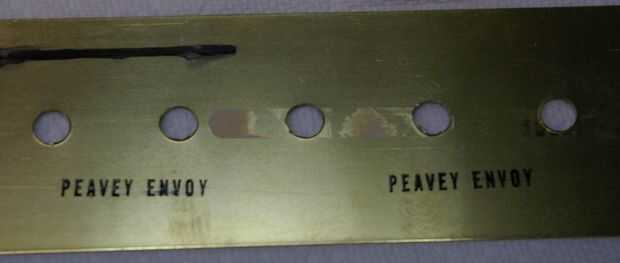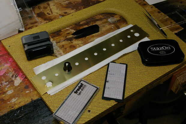 Tipo impresa en el metal fue un divertido reto.  Resultó que pude conseguir un kit de sello personalizable para hacer las etiquetas de control y use una tinta algo única para que sea pegar correctamente.  La tinta es de una empresa llamada "StazOn" ($5) y el kit de sello es "trodat" ($20?).  Ambos vinieron de Michaels (tienda de la manía).  Estaba un poco reacio a comprar estos, pero creo que será útiles para futuros proyectos.  Le da clase de un fresco y retro 50, look militar para su etiquetado.
