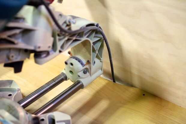 Un cable de extensión corto conecta la sierra con esta tira por debajo de la estación de Sierra de inglete. Me trajo hasta la Sierra de potencia perforando un pequeño orificio en la parte posterior de la cavidad de la sierra para que el enchufe se podría pasar a través al interior del carro.