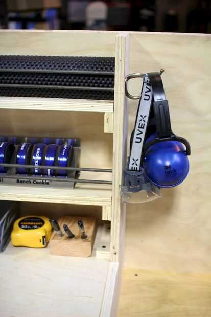 El gancho es un simple gancho de la ferretería. Por cuelga un dedicado par de gafas de seguridad y protección para los oídos. Soy notorio para no siempre uso gafas y protección para los oídos tan a menudo como debería, y es algo sobre que realmente estoy tratando de ser más diligentes, así que espero que el gancho dedicado también ayuda.