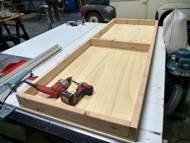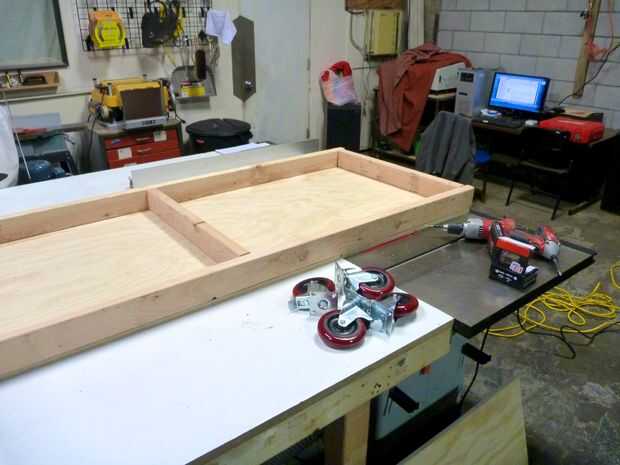 Cortar la hoja de madera contrachapada en un panel de 32 "x 8' y construir una estructura de soporte de 2"x 4"s debajo de él. Los más de 2 "x 4" será s corres debajo de la madera más rígida y dura la caja de torsión. No fui demasiado loco y el carro es mucho fuerte ya que va a obtener un montón de refuerzo adicional.