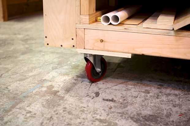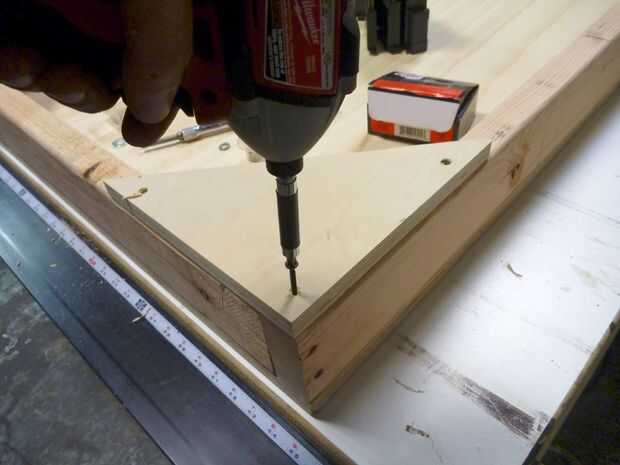 Cortar las piezas de madera contrachapada triangular grande y atornillarlos en las cuatro esquinas para que tenga una superficie para montar el heavy duty trabables para cuando llegue el momento.