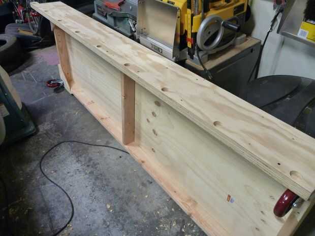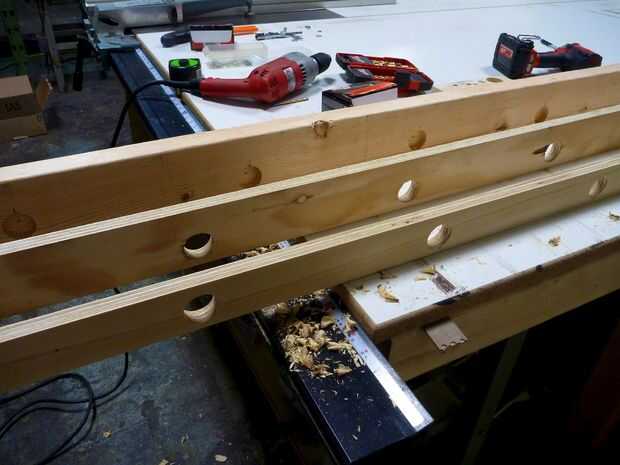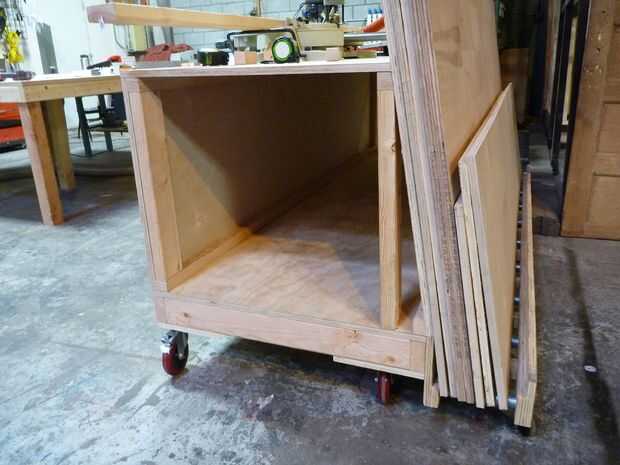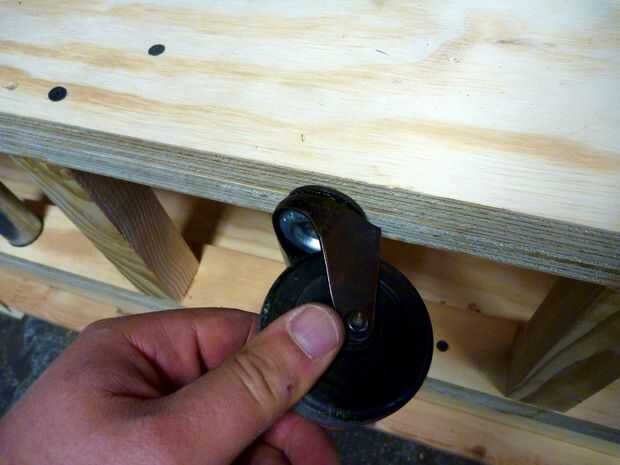 El toque final en el canal de almacenamiento de información de la hoja es simplemente perfore agujeros para las ruedecillas de mediana intensidad, en mi caso, ruedas viejas me quité una silla libre en la calle, e insertarlos en las placas externas del canal. Estas ruedas auxiliares ayudan a tomar la carga de la madera almacenada. Al principio consideré voladizo el canal fuera de la caja de torsión principal sin ninguna ayuda adicional, sin embargo, al hacer algunas pruebas iniciales, rápidamente descubrí que no había real el canal podría apoyar la potencialmente cientos de libras de madera sin ruedas propias.