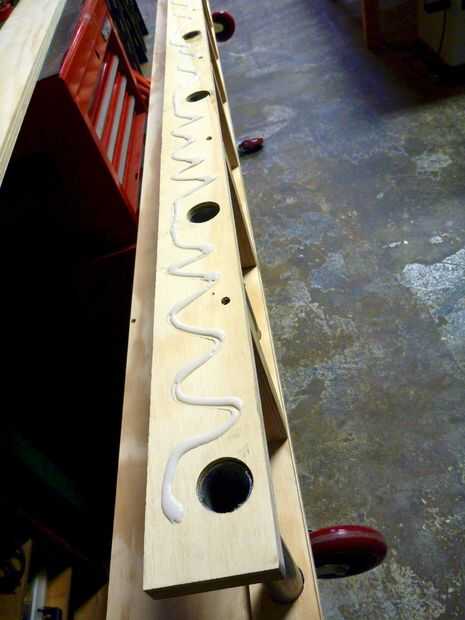 Empezar a ensamblar el canal por primera atornillar una de las tiras que ha perforado los agujeros la percha de madera contrachapada que tienes conectada a la caja de torsión al principio de este paso. Inserte tubos de galvanizado en los agujeros. Haga barras cuadradas de 1.5" en posición entre los tubos de acero, ubicándolos por debajo de las tapas de tubos de acero para que la madera contrachapada se sentará en los tubos y las barras de la Plaza. La culata cuadrada une el canal de soporte de todo - los tubos simplemente apoyan los bienes almacenados de la hoja. Puse pegamento en barras cuadradas y luego los atornillados en la posición de la parte trasera de la tira de suspensión. Una vez que todo lo que esté en su lugar ponerlo en la segunda tira de contrachapado orificios de atornillando las tapas de las barras de madera cuadrada. Otra vez, más pegamento. Luego, usando pegamento y tornillos, fije una nueva tira de madera que servirá como un muro de contención para el almacenamiento de información canal y tapa los agujeros para la tubería de acero. Esta pieza debe ser 8' largo por alto sin embargo desea a muro de contención, el mío es alrededor de 6" de alto.
