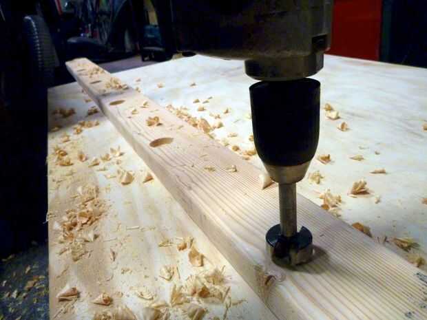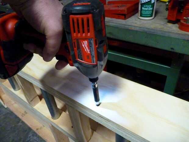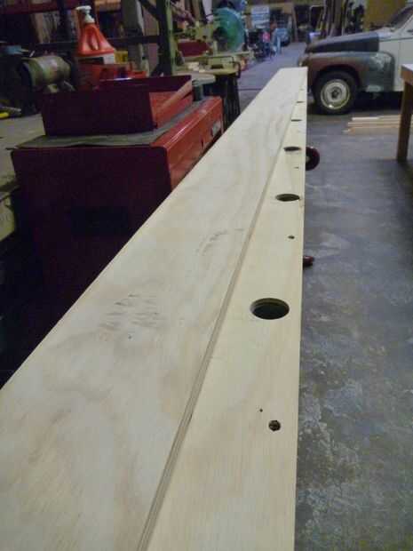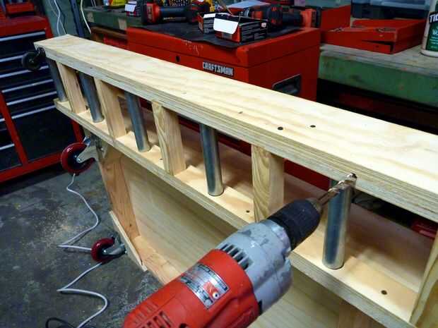 A continuación, cortar dos tiras de madera que son 8' x 3" en la Sierra de mesa. Colocarlos de espalda con espalda y luego taladre a través de ellos con una broca de pala o forstner en intervalos regulares para crear los agujeros de montaje para los "rodillos" que irá debajo de los paneles. El tubo de acero galvanizado actúa como rodillos fijos para reducir la fricción en el borde de la hoja en el almacenamiento de modo que sean fáciles de sacar, es decir, que no gire en su lugar, pero son slick y proporcionar una superficie de fricción limitada para la madera contrachapada en.