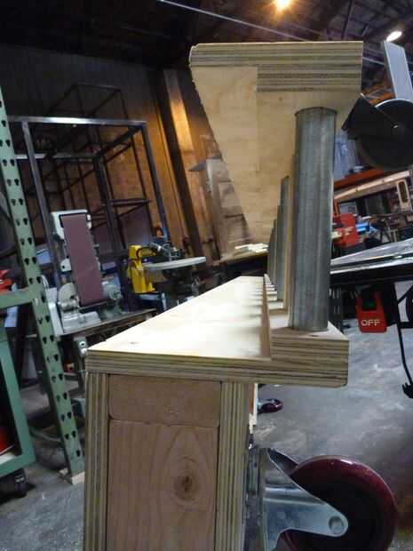 Corte el tubo galvanizado hasta sin embargo profundo quieres que tu canal de soporte de almacenamiento hoja que. Corté mis a alrededor 8", que permite 8 +-hojas de 3/4" material cuando está almacenado en un ligero ángulo para que no vuelque. Un canal más amplio acomodará más madera, sino también harán su estación Sierra de inglete más lejos de la pared.