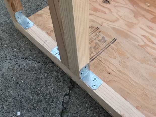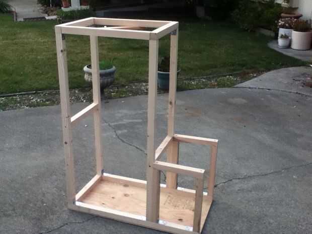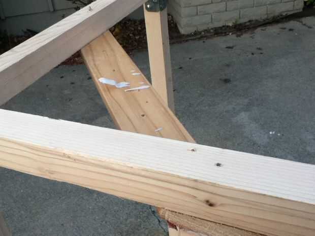 He utilizado pino blanco 2 x 2 en una base de capas 3/4" CDX. Cada paso en esta parte del instructable podría precedido con "Usando gorila pegamento y tornillos, I..." así asumir si ves un empalme, era todo foamy con pegamento en algún momento. Me encanta ese tipo de cosas! La última imagen de arriba muestra el refuerzo de ángulo mientras seca el pegamento.