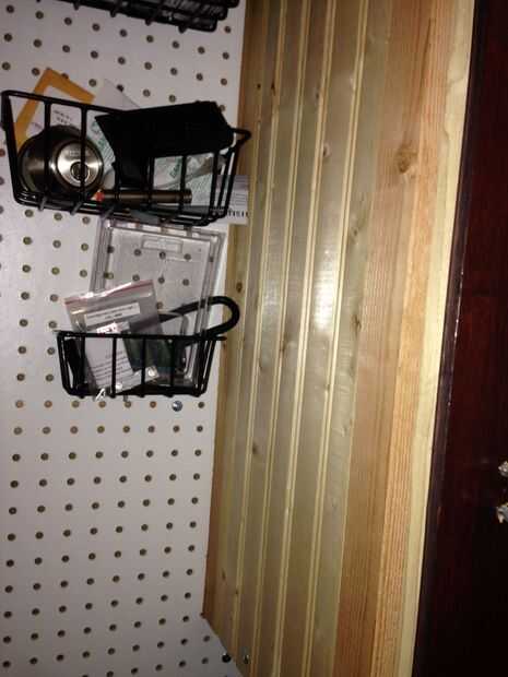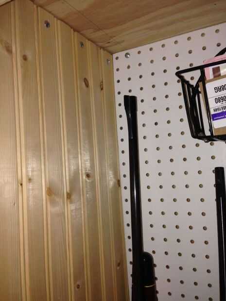 Me encanta el look de la madera y no quería potencialmente bang rifle antiguo de mi abuelo contra acero desnudo, así que terminé el interior con paneles de pino con cuentas. Perforado en la parte posterior me permite cambiar la configuración según sea necesario. Pistolas de largo se sujetan con ganchos revestidos de vinilo.