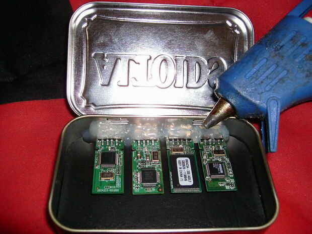 Ahora, todo lo que necesita hacer es colocar cada unidad flash dentro de cada ventana y pegar con pegamento de silicona caliente. NO uso EPOXI u otros materiales de fijación para evitar daño de hardware. Use una dosis generosa de pegamento para que sea muy sólido!