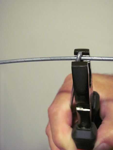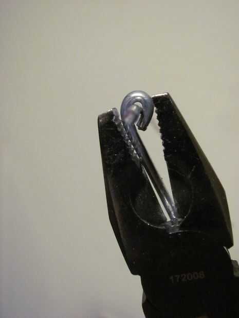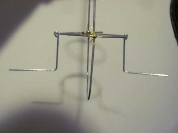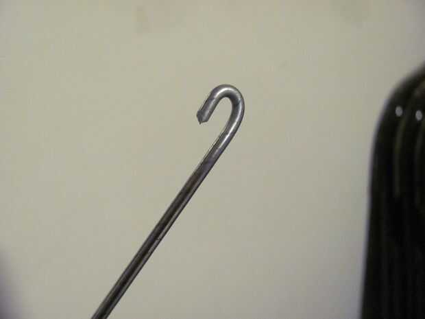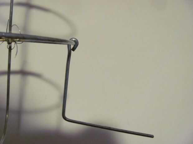Las perchas consisten en una longitud de ~ 6 pulgadas de cable (se puede cortar más adelante si es necesario) unido al anillo de fondo. Esta conexión se hace doblando un pequeño gancho en el extremo del alambre y prensar sobre el alambre de aro. Estas perchas están instalados en el anillo inferior espaciado entre el lazo de apoyo para que los alambres verticales (ayuda lazo y perchas) son todos espaciados uniformemente alrededor del anillo inferior.