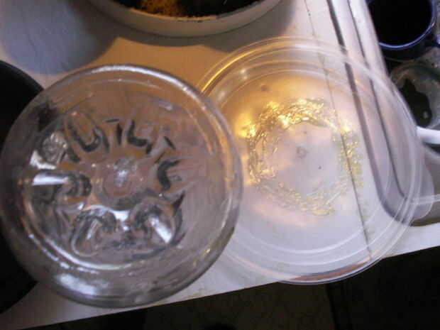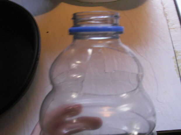 Luego Hágale un agujero en la parte inferior de la botella y a través del centro de la de la tapa del envase de alimento