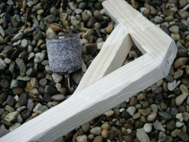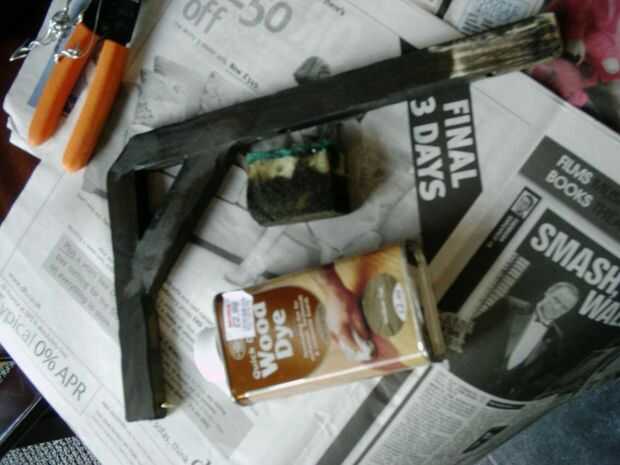 Entonces toda la trama fue manchada. Nuestra opción preferida de color fue 'Roble jacobino'. Entonces fue agregado un pequeño ojal en el extremo de la viga superior de nuestra soga atar a.