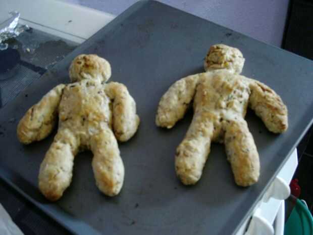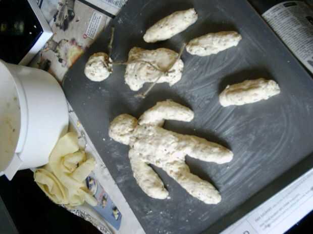 Cada parte fue rodado/formada a mano y después montar alrededor del esqueleto de la cadena en una bandeja de horno ligeramente engrasada. Los chicos poco fueron después cocido al horno en un horno precalentado de alrededor de 250 C/Gas marca 9 para que se endurece rápidamente y mantiene su forma. Se llevaron unos 20 minutos para cocinar uniformemente.