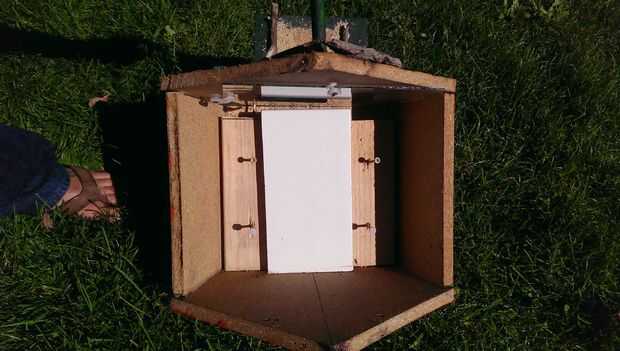 - Cortar un trozo de madera de 2" por 4" por 5". Esto proporcionará una plataforma para el sensor de proximidad frambuesa Pi e IR. Conecte la plataforma frambuesa Pi dentro de la pajarera centrado con la ventana de visualización, sobre 1"- 2" desde el frente de la ventana.