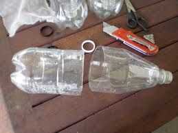 Comedero para pájaros construida reciclado de objetos:Botella de 2L popTapa de tina de helado de 2Ltornillo de la cubierta 1 pulgadaenvases de plástico de bombilla circularalambre1. en la parte inferior de la botella, cortar pequeños agujeros de tama