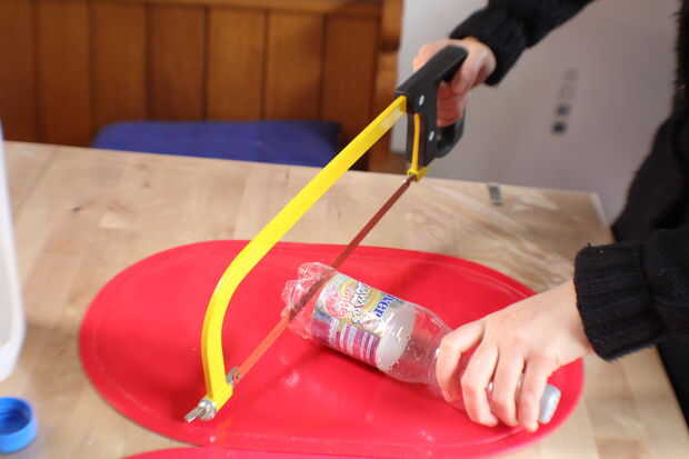 Tenemos que cortar la parte inferior de la botella pequeña y colóquela debajo de la tapa del envase, para que podamos usar esta para llenarlo con las semillas del pájaro.