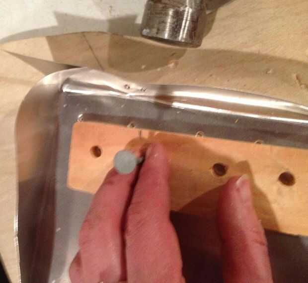 Usar un clavo para hacer orificios de martillo en la chapa. Esto permitirá que el agua drene hacia fuera debe llover en la bandeja. Utilicé un trozo viejo de pegboard para ayudarme a los agujeros del espacio, pero que no es esencial. Asegúrese de que usted martilla sobre lo que será la parte superior (interior) de superficie del metal. Esto es porque el martilleo se dobla el metal hacia afuera y es esencial que aves no se alimentan de la parte levantada ya que se podrían lesionar.