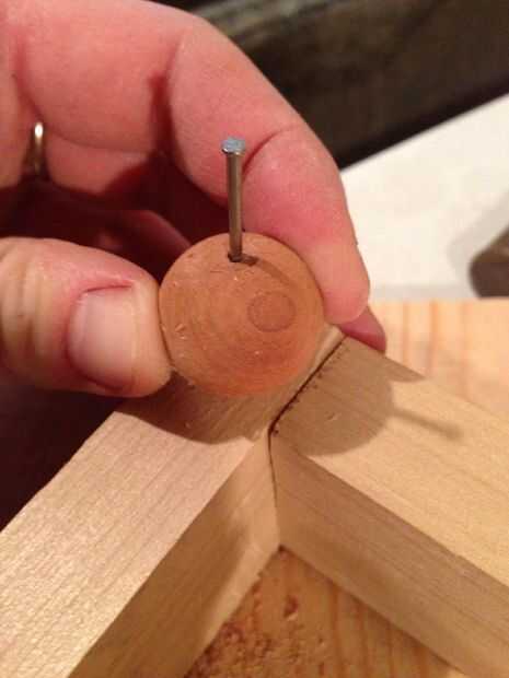 Con una sierra, cortar 4 piezas de madera a la longitud necesaria que hará un marco alrededor de la bandeja. Perfore previamente los orificios y luego clave los 4 lados juntos. Perfore un agujero a través de cada una de las bolas de 4 cedro y luego los clavos en la parte inferior del marco.